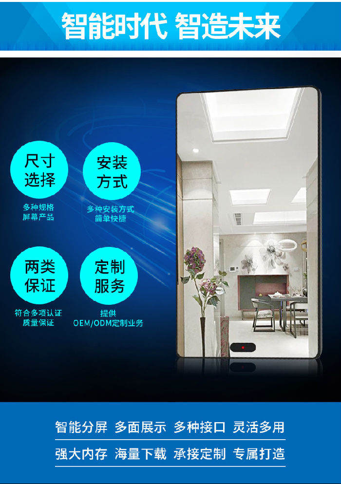 镜面广告机将镜子与广告媒体的完美结合,镜子既是播放器,照镜子就是看广告。让传播面对面,让沟通零距离。真正做到主动传播,强制收看。