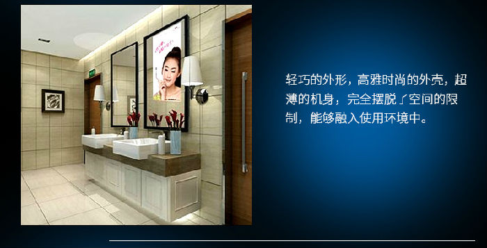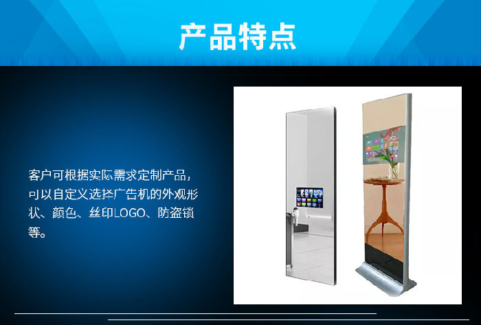 镜面广告机外型简约时尚,精致亮丽。采用分屏技术,画面动态循环。媒体形象好,媒体吸引力大。是综合性价比最高的媒体。