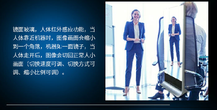 ◆镜面广告机带有红外线感应功能,当人走到它1M以内的范围,广告机能自动缩小广告播放的大小,这时可以把它当作镜子使用。当人离开广告机1M以外,又能恢复全屏播放;