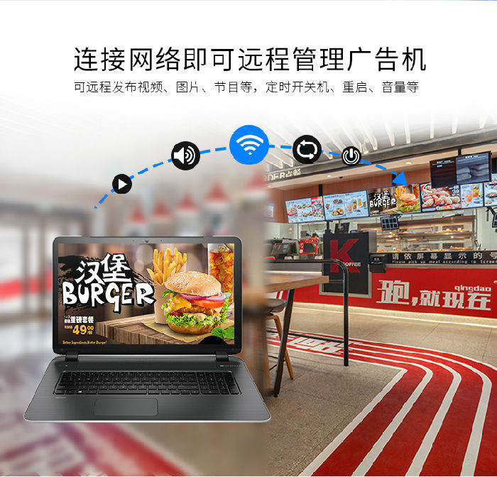 液晶广告机可以用于大厦、楼宇、办公场所局域网的信息/广告发布。通过硬盘、CF卡、路由器、光缆、城域网、PSTN等,系统甚至可以分布到全球各地,实现通过广域网(互联网)的超级信息发布。