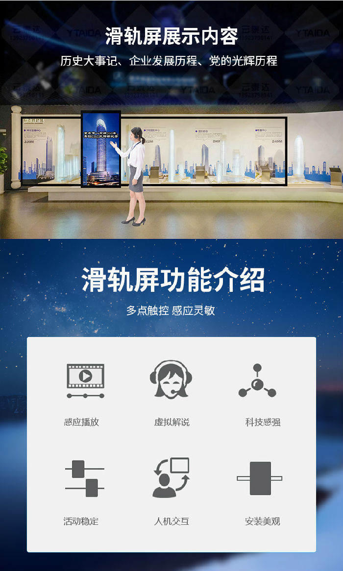运用领域主要在会议展厅、展馆、博物馆、纪念馆展厅展馆以及博物馆等用来展示墙体上画面的内容,现在也开始普遍用于展会,商场,高端店铺,这样不仅使相对枯燥的文字形象展示在视频上方便客户观赏而且还可以更好的解说使客户理解,参观者一目了然,也减轻了解说员的重担。另外大屏存在的信息量也非常大,要比图片文字更能节省场地,使整个展厅更加生动随机,真正实现省电节能,互动滑轨的最好的选择之一,它低碳环保吸引人流,新鲜的互动效果必然会吸引人流的参观,同时好的设计和艺术效果也为展馆,展厅增加一些互动气氛,也提高经济效益,让游客于宣传内容互动,增加了博物馆的知名度。