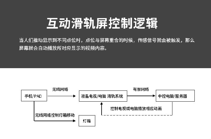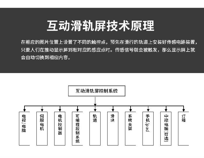 互动滑轨屏采用透明屏和红外触摸框实现互动功能,滑轨系列包含手动滑轨、自动循环滑轨、触控滑轨等,可广泛运用于各种宣传展示环节。该系统以滑动的形式将实体产品、图纸线稿等内容以全新的形式展示在观众面前,更具趣味性及科技感。